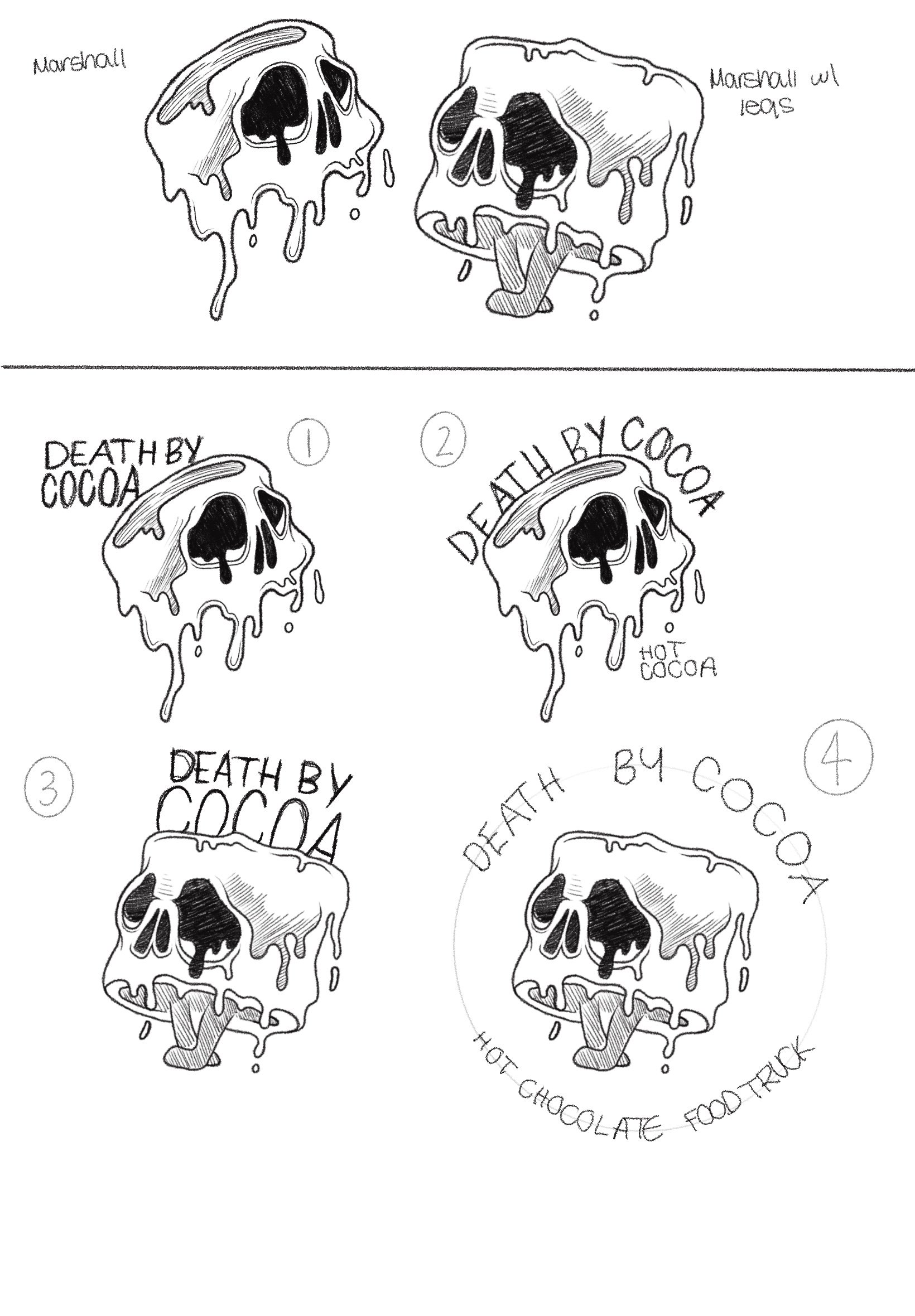 When creating a name for the food truck, I knew I wanted it to represent chocolate. “Death by Cocoa” is a play on words for the infamous cake - death by chocolate. This worked out in my favor because I had already had the logo of the melting marshmallow skull in my head.