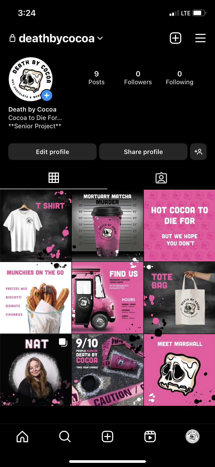 When creating Death by Cocoa, I knew I wanted a bold, out of the box design for the entire brand. Due to the topic of death being implemented into it, I researched other brands that also shed some light on the same topic and found they were more common than I thought going into this. Most of the brands I researched were similar with their dark color palettes and their edgy type, so to make mine stand out, I chose a more vibrant color as well as a rounder typeface