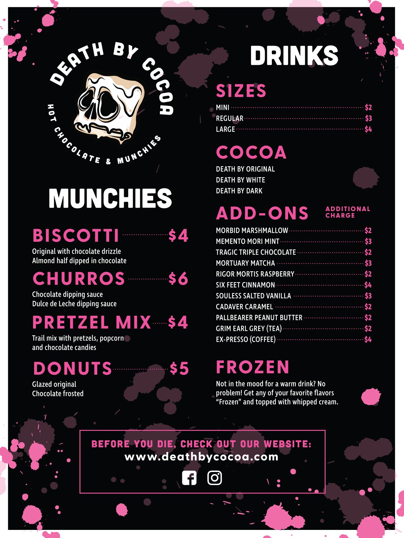 Death by Cocoa is a fictional alternative styled food truck that is stationed in Portland, Oregon, and specializes in hot chocolate. It takes the simple chocolate drink to a whole new level by implementing new flavors that are not commonly sold at your local grocery store.